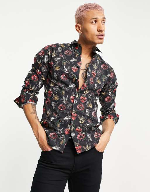 Twisted Tailor Long Sleeve Shirt With Tattoo Print In Black Asos